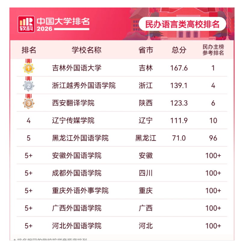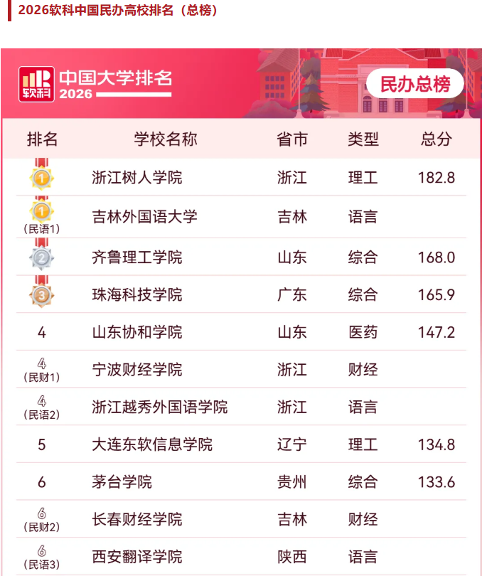 4月15日,高等教育专业评价机构软科正式发布“2026软科中国大学排名”,我校位列“中国民办高校总榜”第4名,较去年提升2位,创历史新高。同时,继续稳居“中国民办高校(语言类)”排位第2名。高等教育专业评价机构软科排名是社会和业界公认的最具权威性的高校评价。此次榜单排名提升不仅是我校办学综合实力与办学核心竞争力持续增强的标志,更彰显了我校健康厚实的发展基础和“十五五”良好的开局势头。